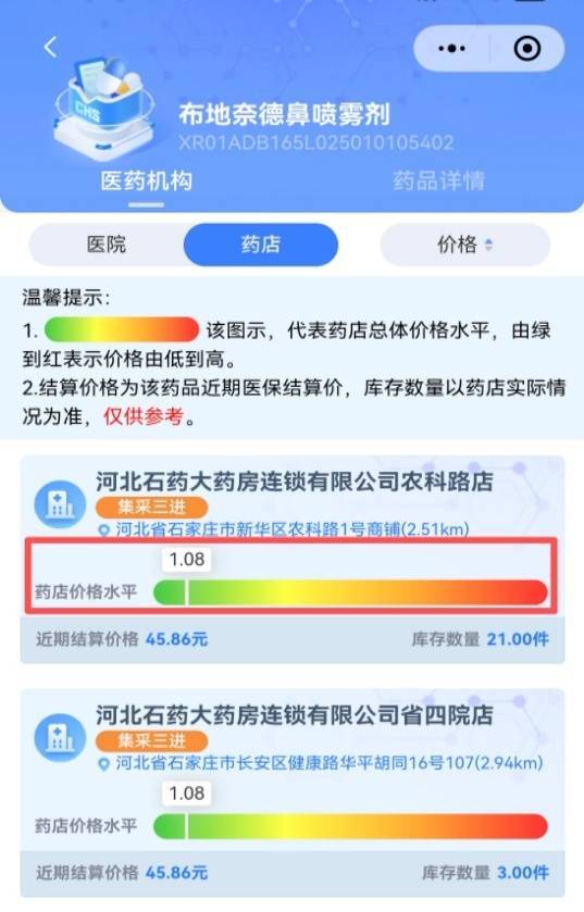 r据悉,“药店价格热力图”是河北省医保局响应国家试点首家推出的创新举措,通过采集区域内定点药店的药品价格信息,形成反映每家药店药品价格总水平高低的“指数”,并将地图上的药店由绿到红标上颜色,让消费者可以一眼分辨出哪些药店的价格可能更实惠。